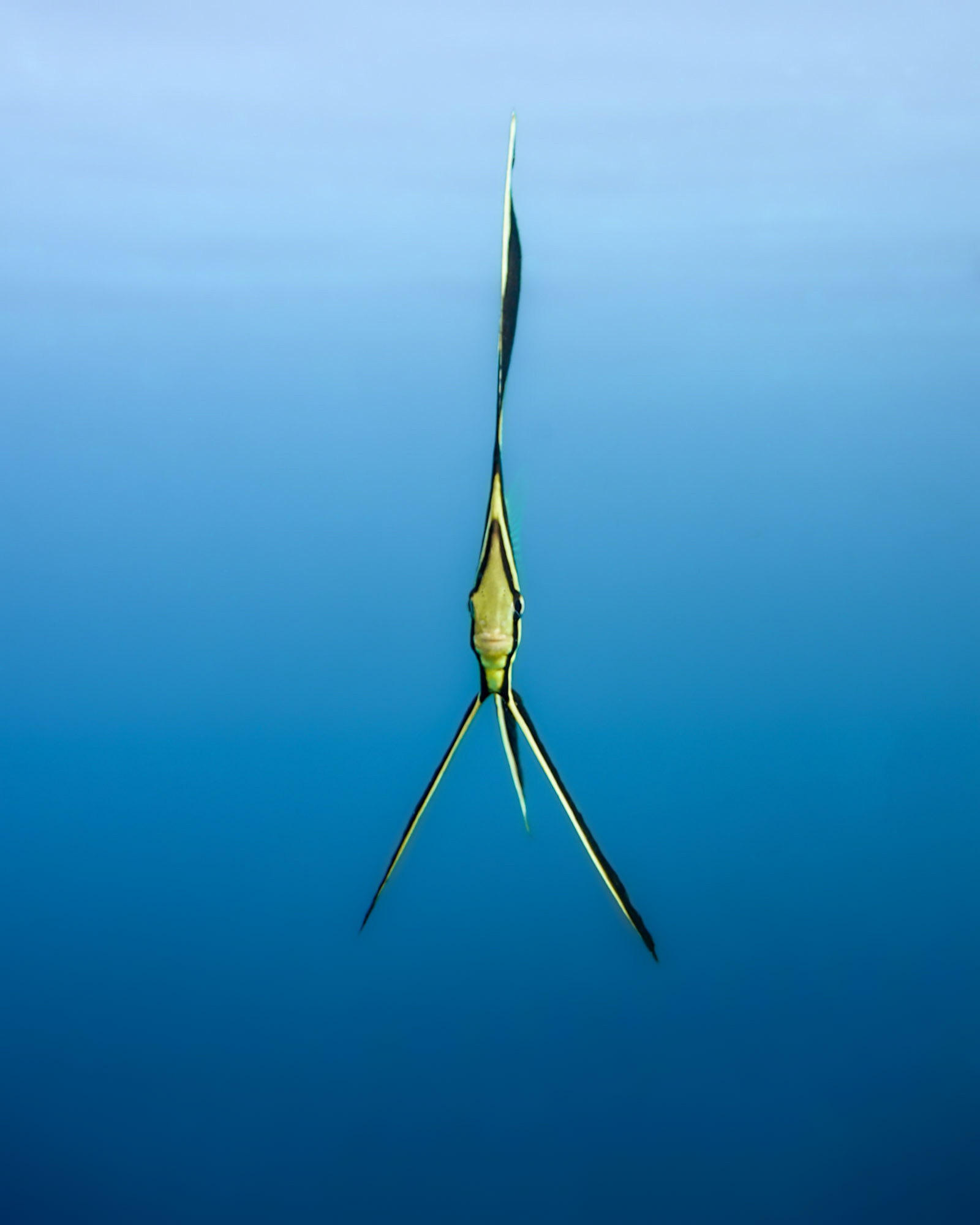 “Juvenile batfish like to hang around jetties in Raja Ampat, and Arborek is no exception. Freediving down, the fish dart off as soon as I break the surface, changing my attempt to photograph them into a true cat-and-mouse game. After numerous tries I browse through my photos, out of breath and with low expectations. Turns out, one of the batfish had been waiting for its portrait all along – posting perfectly in front of my lens without me noticing. One of my first photos taken with my first underwater photography set up many years ago, this remains one of my personal favourites.”