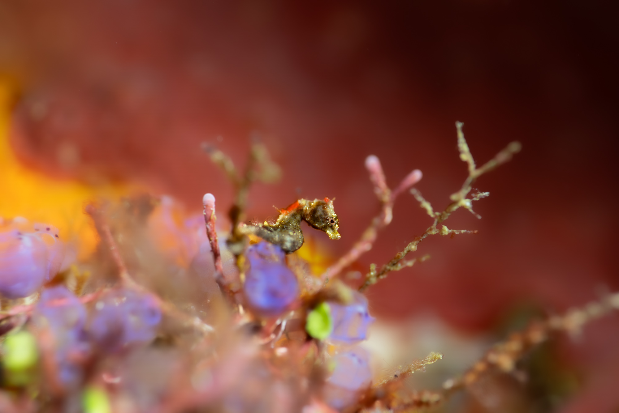 “A glimpse into the endless macro world of the smallest ocean critters, I photographed this pontohi pygmy seahorse a stone’s throw from Arborek island. A tall coral structure at 15m – covered with tunicates (purple), coralline algae (red) and encrusting coral (yellow) – had become home to a seahorse no bigger than a pinky nail. Perched on a hydroid, his sparkly figure stand out against the fiery background. Arguably the hardest species of seahorse to find in Raja Ampat, I felt lucky that I stumbled upon it in such a colourful scene.”